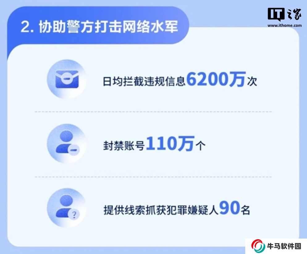 在打擊網(wǎng)絡(luò)水軍視頻方面,抖音全年封禁違規(guī)“水軍”賬號 110 萬個,通過技術(shù)手段日均攔截違規(guī)信息 6200 萬次,同時公司向警方提供線索,協(xié)助抓捕犯罪嫌疑人 90 名。