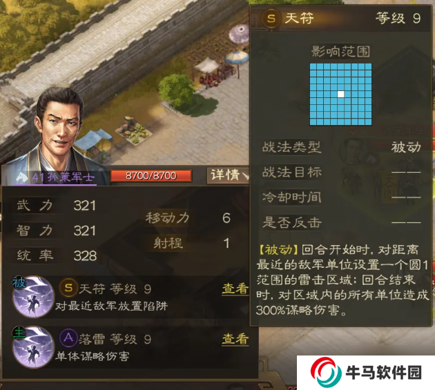 然后是天符軍士,會對距離最近的敵軍設(shè)置一個圓1范圍(即十字型)的雷擊區(qū)域,會對區(qū)域所有單位造成傷害,天符軍士不會移動。