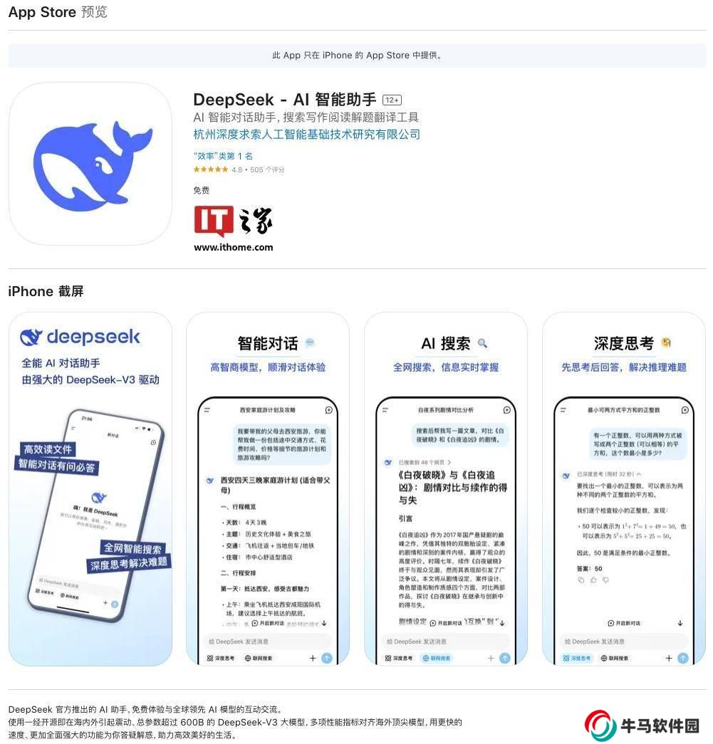 近日,AI領(lǐng)域迎來了一則震撼消息,深度求索公司旗下的AI智能助手應(yīng)用DeepSeek,成功在蘋果App Store美區(qū)下載榜上超越了ChatGPT,一舉奪得免費應(yīng)用榜榜首的位置。