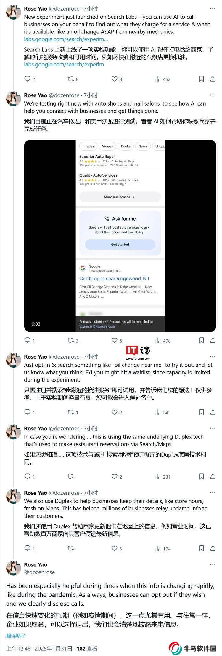 據(jù)悉,“Ask for Me”功能目前已在多家美國汽車修理廠和美甲沙龍店等場所進行了試點合作。用戶只需在Search Labs中選擇加入,隨后搜索如“附近的換油服務(wù)點”或“美甲沙龍推薦”等關(guān)鍵詞,即可體驗該功能。谷歌的人工智能系統(tǒng)將代替用戶與商家進行溝通,快速獲取營業(yè)時間、費用等關(guān)鍵信息。