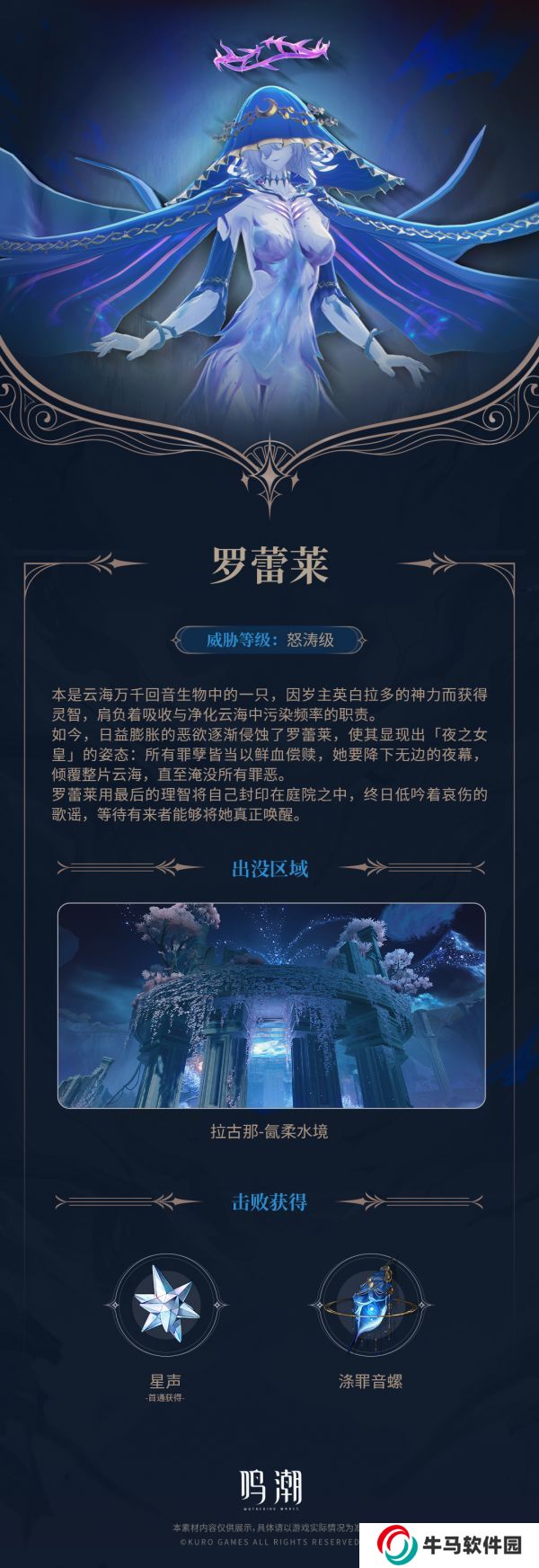 本是云海萬(wàn)千回音生物中的一只,因歲主英白拉多的神力而獲得靈智,肩負(fù)著吸收與凈化云海中污染頻率的職責(zé)。如今,日益膨脹的惡欲逐漸侵蝕了羅蕾菜,使其顯現(xiàn)出「夜之女皇」的姿態(tài):所有罪孽皆當(dāng)以鮮血償贖,她要降下無(wú)邊的夜幕,傾覆整片云海,直至淹沒(méi)所有罪惡。羅蕾萊用最后的理智將自己封印在庭院之中,終日低吟著傷的歌謠,等待有來(lái)者能夠?qū)⑺嬲龁拘选?/p>