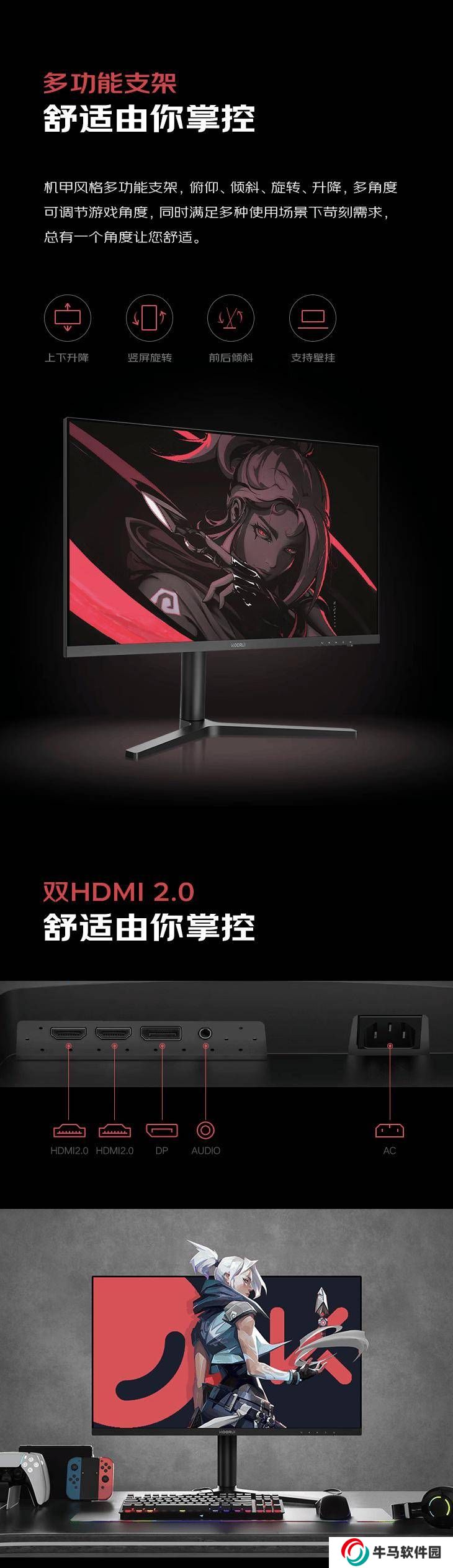 這款顯示器的支架設(shè)計(jì)也相當(dāng)人性化,支持傾斜、升降、旋轉(zhuǎn)等多種調(diào)節(jié)方式,用戶可以根據(jù)自己的使用習(xí)慣進(jìn)行調(diào)整。同時(shí),顯示器本體還支持VESA 75x75mm壁掛,方便用戶進(jìn)行多種安裝方式的選擇。