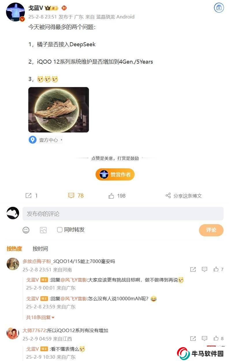 雖然目前iQOO中國官方尚未正式宣布這一政策調(diào)整是否適用于國行機型,但已有一些線索讓國內(nèi)用戶看到了希望。iQOO產(chǎn)品經(jīng)理@戈藍V在微博上針對用戶提問進行了互動,其中涉及到了OriginOS系統(tǒng)是否接入DeepSeek技術,以及iQOO 12系列手機系統(tǒng)維護周期是否延長至“4代/5年”等問題。盡管他沒有直接確認國行機型會跟進這一策略,但從其互動中的暗示和表情符號來看,國內(nèi)用戶有望享受到同樣的服務升級。