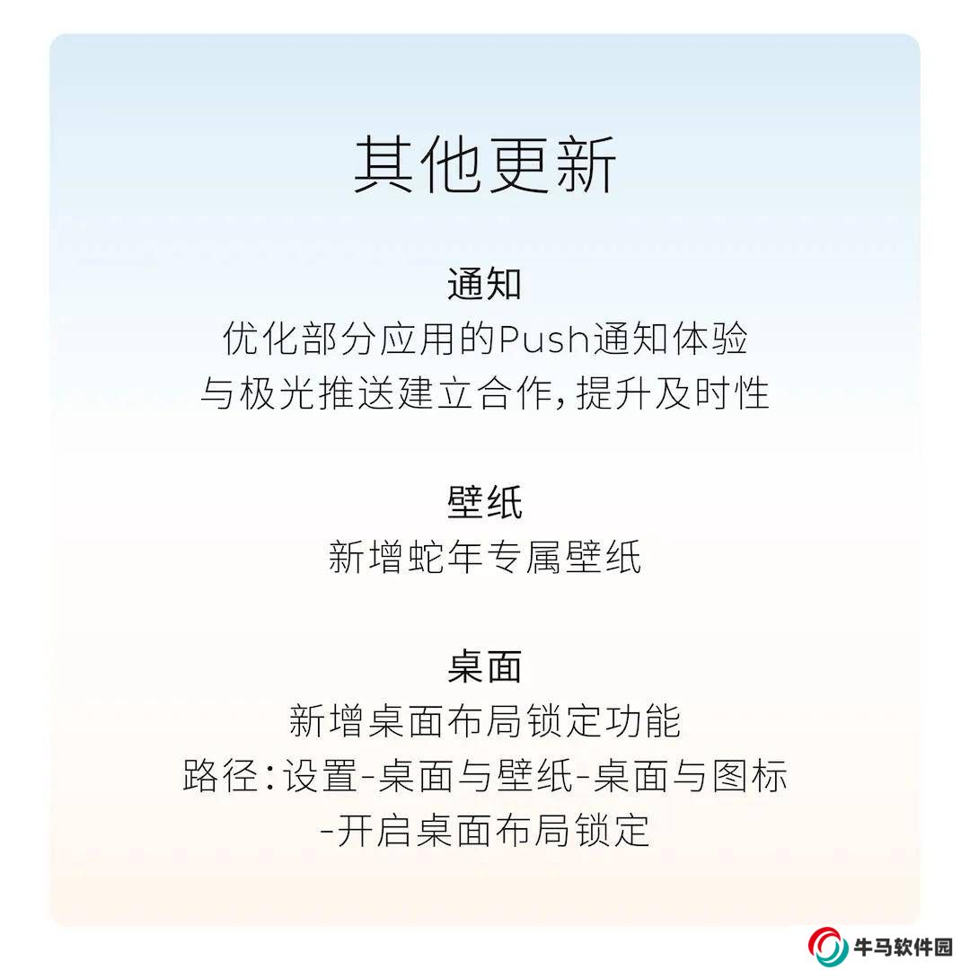 除了上述功能外,本次更新還帶來(lái)了多項(xiàng)實(shí)用的小改進(jìn)。例如,部分應(yīng)用的Push通知體驗(yàn)得到了優(yōu)化,與極光推送建立合作,提升了通知的及時(shí)性。同時(shí),為了慶祝即將到來(lái)的蛇年,新增了專屬的蛇年壁紙。還新增了桌面布局鎖定功能,用戶可以在設(shè)置中開啟該功能,以防止桌面布局被意外更改。