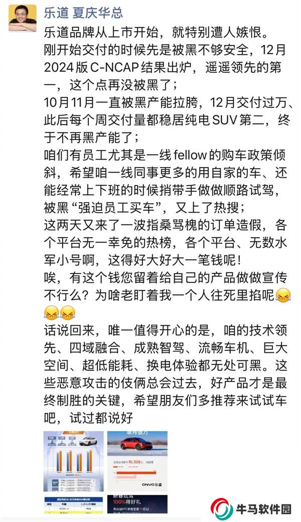 近期,針對樂道汽車的一系列爭議事件,樂道汽車副總裁夏慶華通過個人社交媒體平臺發(fā)表了一番言論,對強制員工購車和訂單造假的傳聞進行了回應。