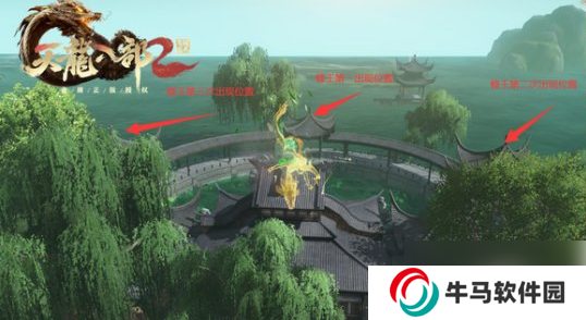 我們直接跳到頭頂最高處的建筑,你會看到一個半圓形的長條建筑,建筑一共有三處亭子,蜂王第一次就出現(xiàn)在正中間的亭子上方,我們直接輕功跳過去對話就行了。