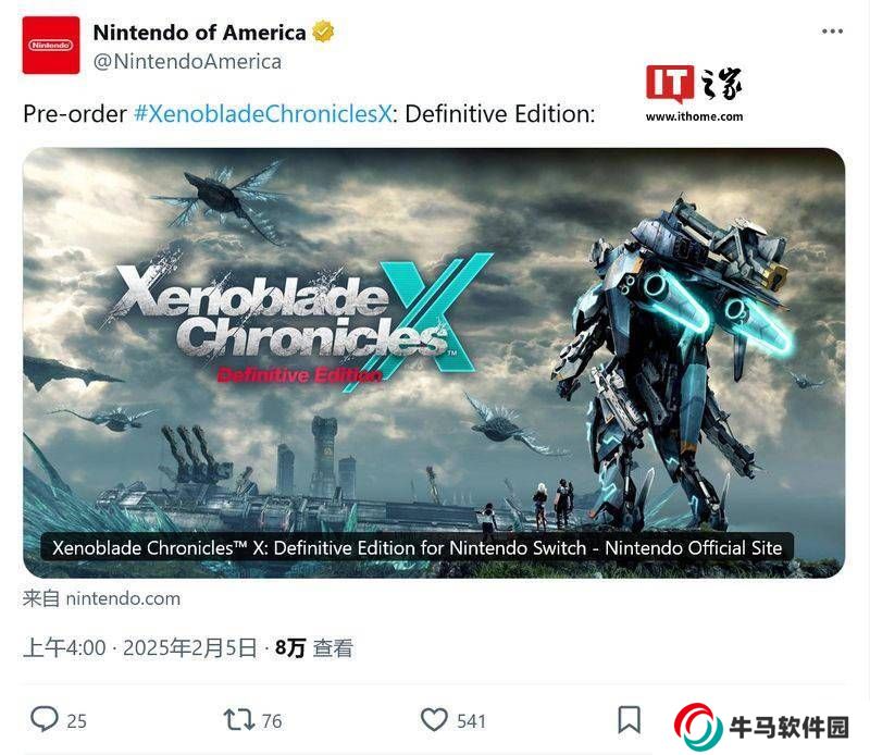 任天堂美國官方近日在X平臺上宣布了一則令游戲迷們振奮的消息:《異度之刃 X 終極版》現(xiàn)已開放預購,這款備受期待的作品將于3月20日登陸Switch游戲掌機。預購價格為59.99美元,折合人民幣約436元。