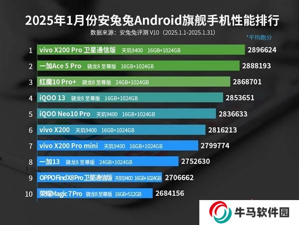 近日,安兔兔揭曉了2025年1月份Android旗艦手機(jī)性能榜單,vivo X200 Pro衛(wèi)星通信版憑借其搭載的天璣9400處理器,以2896624的平均跑分榮登榜首,彰顯了安卓旗艦手機(jī)的頂級(jí)實(shí)力。