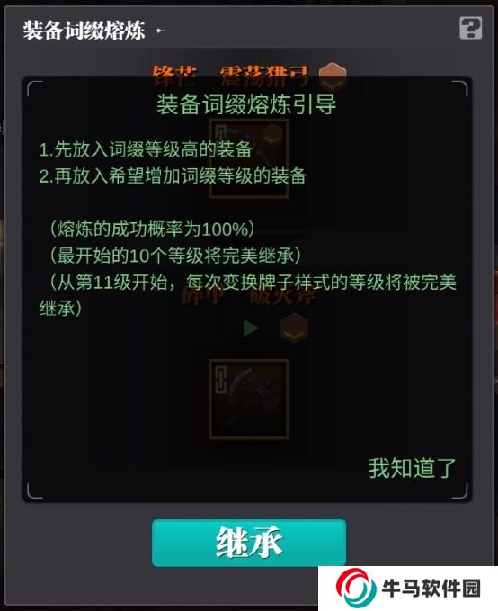 強(qiáng)化繼承即繼承其他裝備的詞綴強(qiáng)化等級。按照繼承規(guī)則,詞綴等級前10級為無傷繼承,即1-10級為100%繼承;后續(xù)每五級為一個(gè)階段,10級以后的每個(gè)階段的繼承都會(huì)掉落至該階段的初始等級,例如14級繼承則掉落至11級。