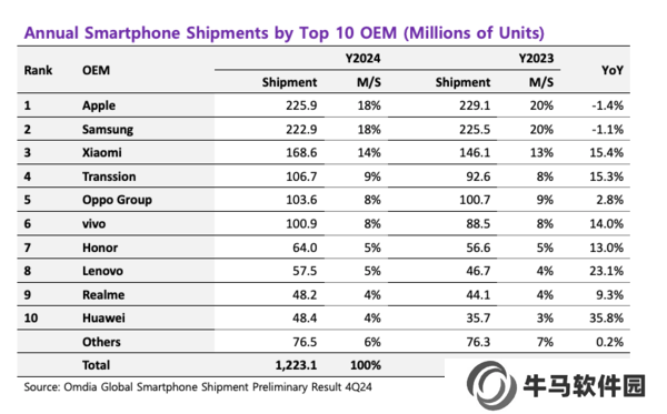 在這份報(bào)告中,蘋果繼續(xù)穩(wěn)坐全球智能手機(jī)市場的頭把交椅,盡管其2024年的出貨量相比2023年略有下滑,但依舊展現(xiàn)出強(qiáng)大的市場影響力。與此同時(shí),小米的表現(xiàn)尤為亮眼,該季度不僅超出了市場預(yù)期,全年出貨量更是高達(dá)1.69億部,實(shí)現(xiàn)了15.3%的同比大幅增長。