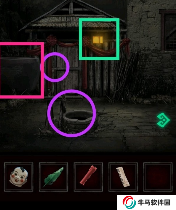 然后用密碼打開門,得到道具裝在水井上。綠框查看燈籠線索。粉框的缸內(nèi)有蟲子。