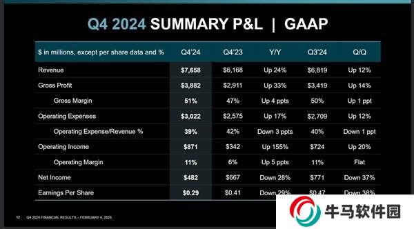 根據(jù)美國通用會計準(zhǔn)則統(tǒng)計,AMD在2024年第四季度實現(xiàn)了76.58億美元的收入,與去年同期相比增長了24%。在這一季度中,公司的毛利潤達(dá)到38.82億美元,同比增長33%,毛利率更是達(dá)到了51%,同比增長4個百分點。營業(yè)收入方面,AMD實現(xiàn)了8.71億美元的收入,同比增長高達(dá)155%。然而,凈利潤方面則出現(xiàn)了28%的同比下降,為4.82億美元。