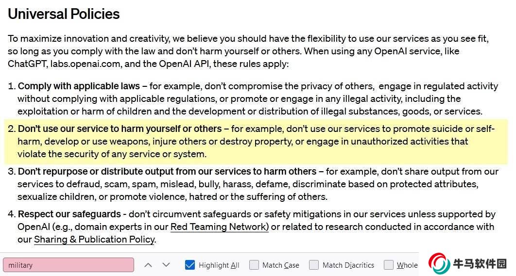 值得注意的是,OpenAI的政策在過去一年中有所調(diào)整。去年初,OpenAI悄然從其使用政策中刪除了“明確禁止將其技術(shù)用于軍事目的”的條款。此前,其政策還明確禁止“具有高身體傷害風(fēng)險(xiǎn)的活動”,特別是武器開發(fā)、軍事和戰(zhàn)爭。然而,在新政策中,雖然保留了“不得使用其服務(wù)傷害自己或他人”的禁令,并以“開發(fā)或使用武器”為例,但“軍事和戰(zhàn)爭”這一更全面的禁令已被移除。