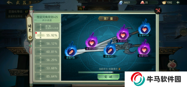 重?cái)?shù)越高,需要的地寒石就越多,武器每1重可以鑄靈六次,鑄靈六次后達(dá)到突破評(píng)分就突破到下一重,突破需要天焱砂,通過(guò)伏魔和秘寶商店獲取。