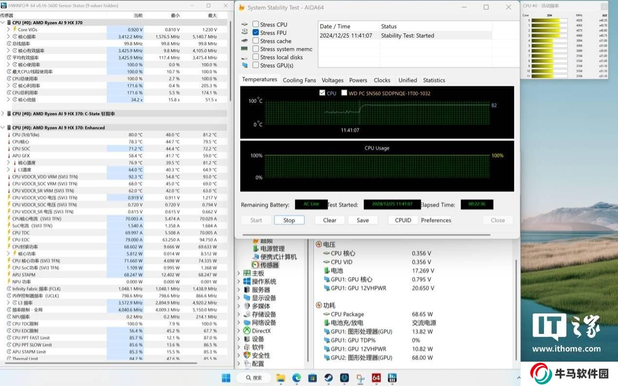 在散熱與性能釋放方面,絕影16 AI+銳龍版表現(xiàn)出色。單烤CPU時(shí),功耗可穩(wěn)定在70W,溫度控制在80度;單烤GPU時(shí),功耗維持在105W,溫度82.2度。雙烤測(cè)試下,整機(jī)性能釋放可達(dá)125W,CPU功耗約42W,GPU功耗約83W,散熱調(diào)校均衡。