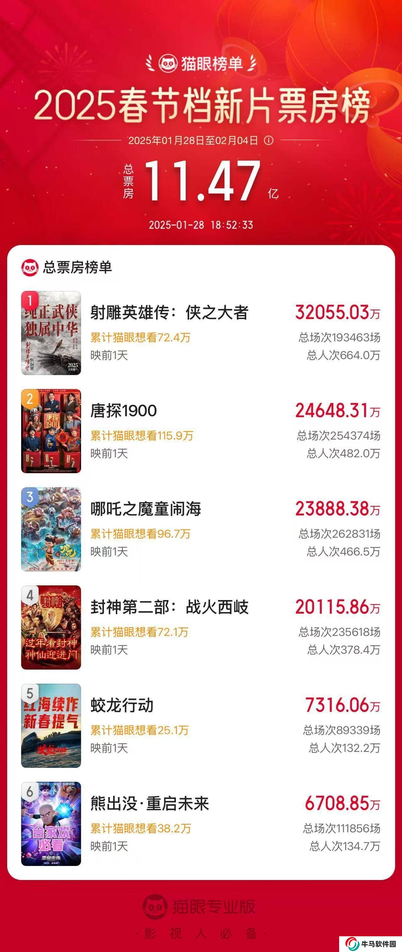 與此同時(shí),2025年春節(jié)檔的預(yù)售情況同樣令人矚目。截至1月28日17時(shí)20分,春節(jié)檔新片預(yù)售票房已突破11億元大關(guān),顯示出觀眾對(duì)于新春電影盛宴的熱烈期待。其中,《射雕英雄傳:俠之大者》、《唐探1900》以及《哪吒之魔童鬧?!啡坑捌?,憑借各自獨(dú)特的題材和強(qiáng)大的制作團(tuán)隊(duì),成功躋身春節(jié)檔新片票房榜前三甲。