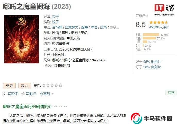 在春節(jié)檔的眾多影片中,《哪吒之魔童鬧海》的表現(xiàn)尤為搶眼。該片不僅在票房上取得了驕人的成績,還在口碑上贏得了觀眾的一致好評。目前,該片在豆瓣上的評分高達(dá)8.5分,其中47%的觀眾給予了五星評價,37.1%的觀眾給予了四星評價,僅有12.7%的觀眾給出了三星評價。這樣的口碑表現(xiàn),無疑為影片的持續(xù)熱映提供了有力的支撐。