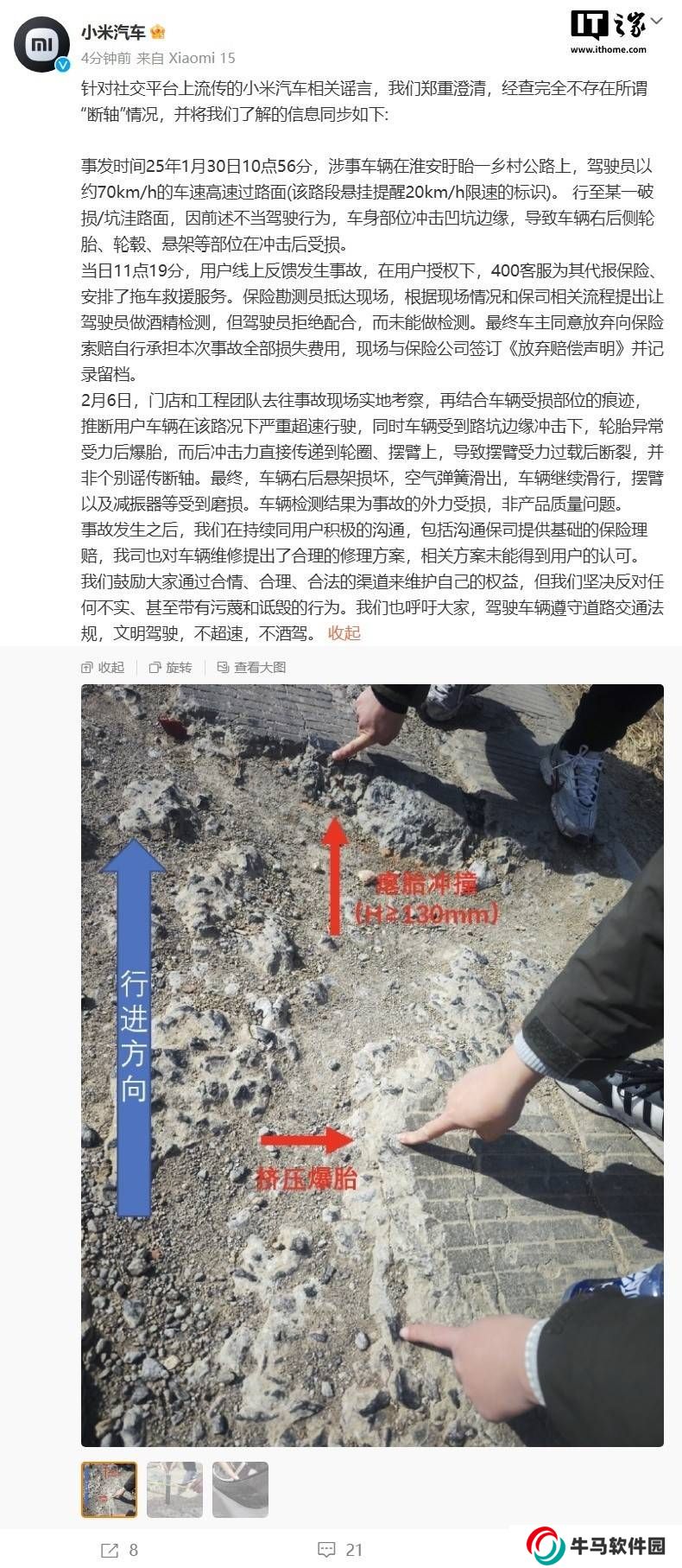 為了徹底查清事故原因,小米汽車在2月6日組織門店和工程團(tuán)隊(duì)前往事故現(xiàn)場(chǎng)進(jìn)行了實(shí)地考察。通過仔細(xì)分析車輛受損部位的痕跡,團(tuán)隊(duì)推斷出,事故發(fā)生時(shí),車輛可能嚴(yán)重超速行駛,并且受到了路坑邊緣的強(qiáng)烈沖擊。這一沖擊導(dǎo)致空氣彈簧滑出并最終斷裂,同時(shí)擺臂也因受力過載而發(fā)生斷裂。小米汽車強(qiáng)調(diào),這并非網(wǎng)絡(luò)上謠傳的“斷軸”問題。
