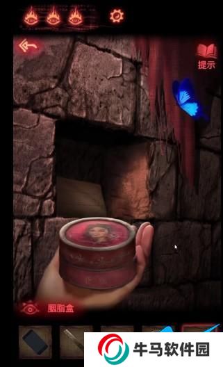 18、得到胭脂粉后去門口機(jī)關(guān)的位置進(jìn)行解鎖,把蝴蝶裝進(jìn)盒子。