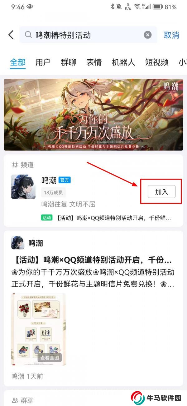 2、在搜索欄這里,我們可以在下面看到鳴潮和qq頻道的活動(dòng)。我們點(diǎn)擊加入,就算是進(jìn)入頻道了。
