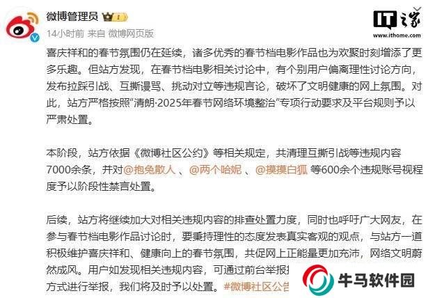 公告強調(diào),微博已根據(jù)“清朗?2025年春節(jié)網(wǎng)絡(luò)環(huán)境整治”專項行動的要求,并遵循平臺的相關(guān)規(guī)則,對違規(guī)內(nèi)容進行了嚴肅處理。在這一階段的管理行動中,微博共清理了超過7000條涉及互撕、挑釁等違規(guī)內(nèi)容,并對包括@抱兔散人、@兩個哈妮、@摸摸白狐等在內(nèi)的600多個違規(guī)賬號實施了不同程度的階段性禁言措施。