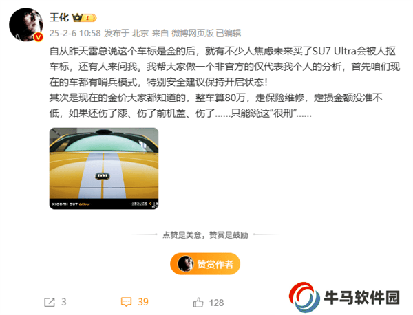 王化進(jìn)一步指出,考慮到當(dāng)前金價(jià)高昂,若真的發(fā)生車標(biāo)被盜事件,維修費(fèi)用或許不菲。以SU7 Ultra近80萬元的售價(jià)估算,若通過保險(xiǎn)理賠,定損金額可能會相當(dāng)可觀。更不必說,摳取車標(biāo)過程中可能造成的車身漆面損傷、前機(jī)蓋劃痕等附加損害,這些都將讓肇事者面臨法律的嚴(yán)懲,可謂“得不償失”。