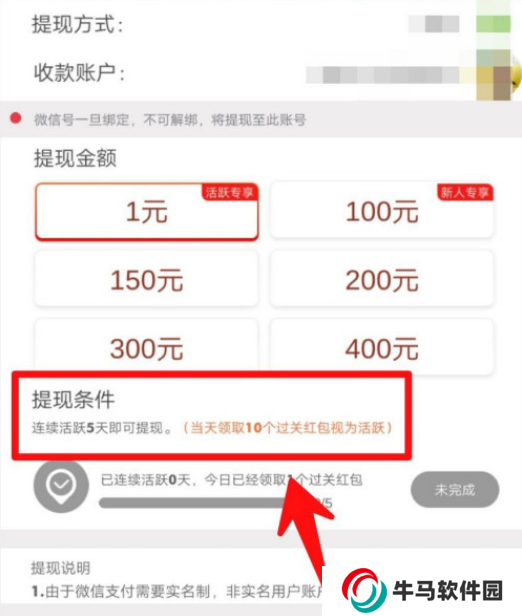 5.選擇提現(xiàn)金額,即可進(jìn)行提現(xiàn)(1元提現(xiàn)需要連續(xù)登陸5天軟件才可以提現(xiàn))