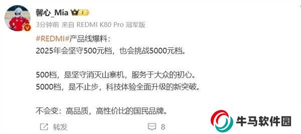 近期,REDMI品牌在產(chǎn)品規(guī)劃上的新動向引起了廣泛關(guān)注。REDMI產(chǎn)品經(jīng)理馨心_Mia通過微博分享了2025年的產(chǎn)品線藍圖,揭示了品牌在市場布局上的兩大核心策略。據(jù)透露,REDMI今年將堅守500元價