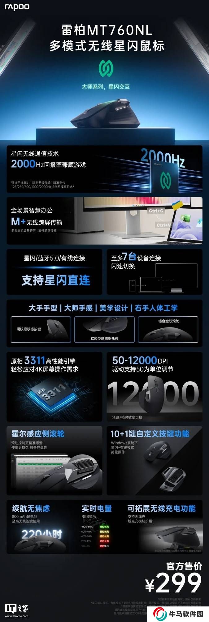 雷柏公司近期推出了一款名為MT760NL星閃的新款鼠標(biāo),市場定價為299元人民幣,吸引了眾多消費者的目光。這款鼠標(biāo)不僅搭載了高性能的原相3311傳感器,還提供了5檔可調(diào)回報率,最高可達(dá)到驚人的2000
