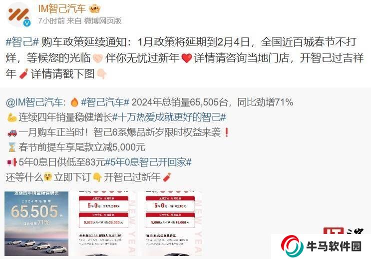 智己汽車科技有限公司在其官方微博上于今日凌晨發(fā)布了一則重要通知,宣布原本于1月實(shí)施的購(gòu)車優(yōu)惠政策將延長(zhǎng)至2月4日,以滿足更多消費(fèi)者的購(gòu)車需求。與此同時(shí),公司還透露,春節(jié)期間,全國(guó)近百座城市的服務(wù)網(wǎng)點(diǎn)將