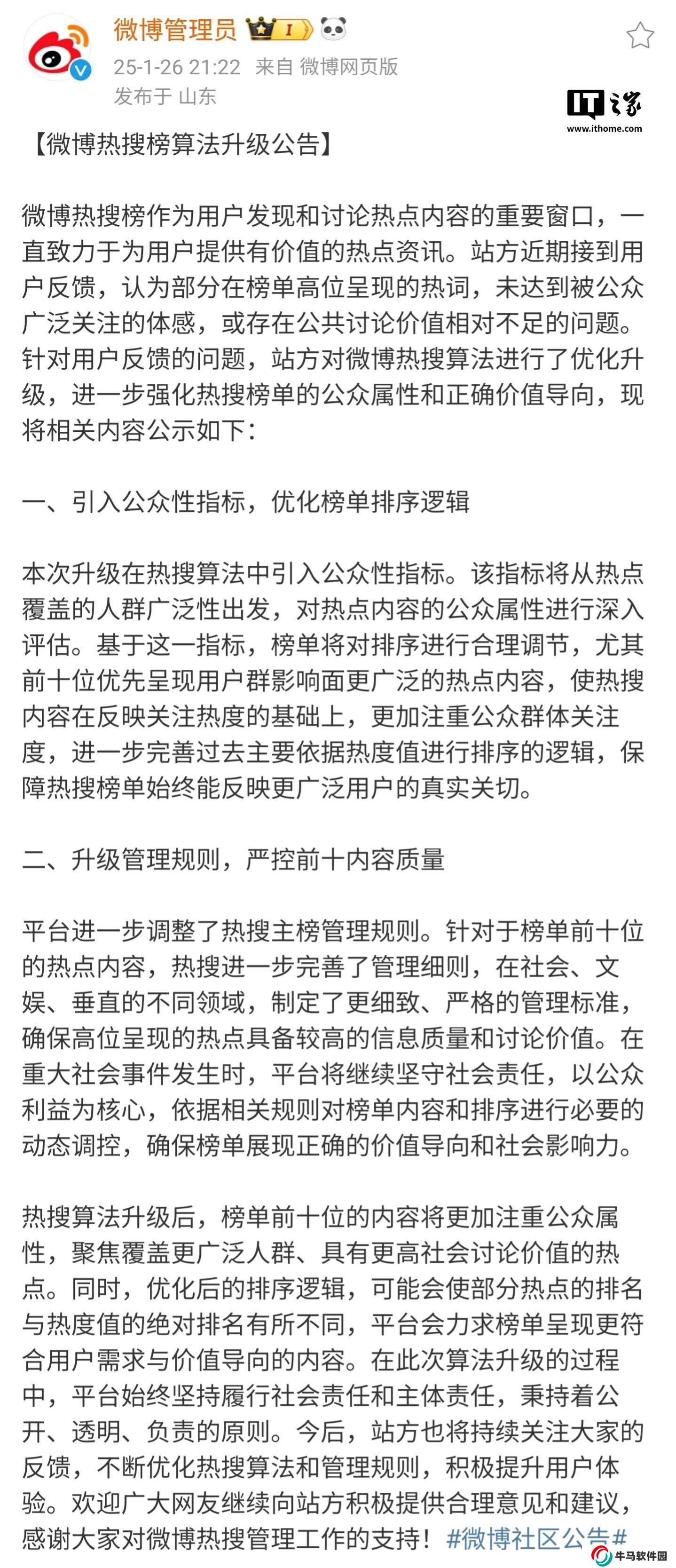 近日,微博平臺(tái)發(fā)布了一項(xiàng)關(guān)于熱搜榜算法的重要升級(jí)公告,旨在響應(yīng)用戶反饋,提升熱搜榜單的公眾認(rèn)可度和價(jià)值導(dǎo)向。據(jù)公告透露,微博方面收到了部分用戶的意見(jiàn),指出熱搜榜上部分高位熱詞并未廣泛引起公眾關(guān)注,或缺