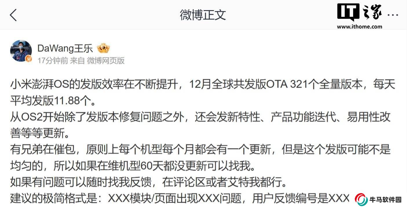 近日,小米公司應(yīng)用軟件部總監(jiān)王樂通過微博平臺(tái)透露了小米澎湃OS的最新進(jìn)展。他指出,小米澎湃OS的發(fā)版效率正顯著提升,去年12月期間,全球范圍內(nèi)共發(fā)布了321個(gè)OTA全量版本,日均發(fā)布量高達(dá)11 88個(gè)