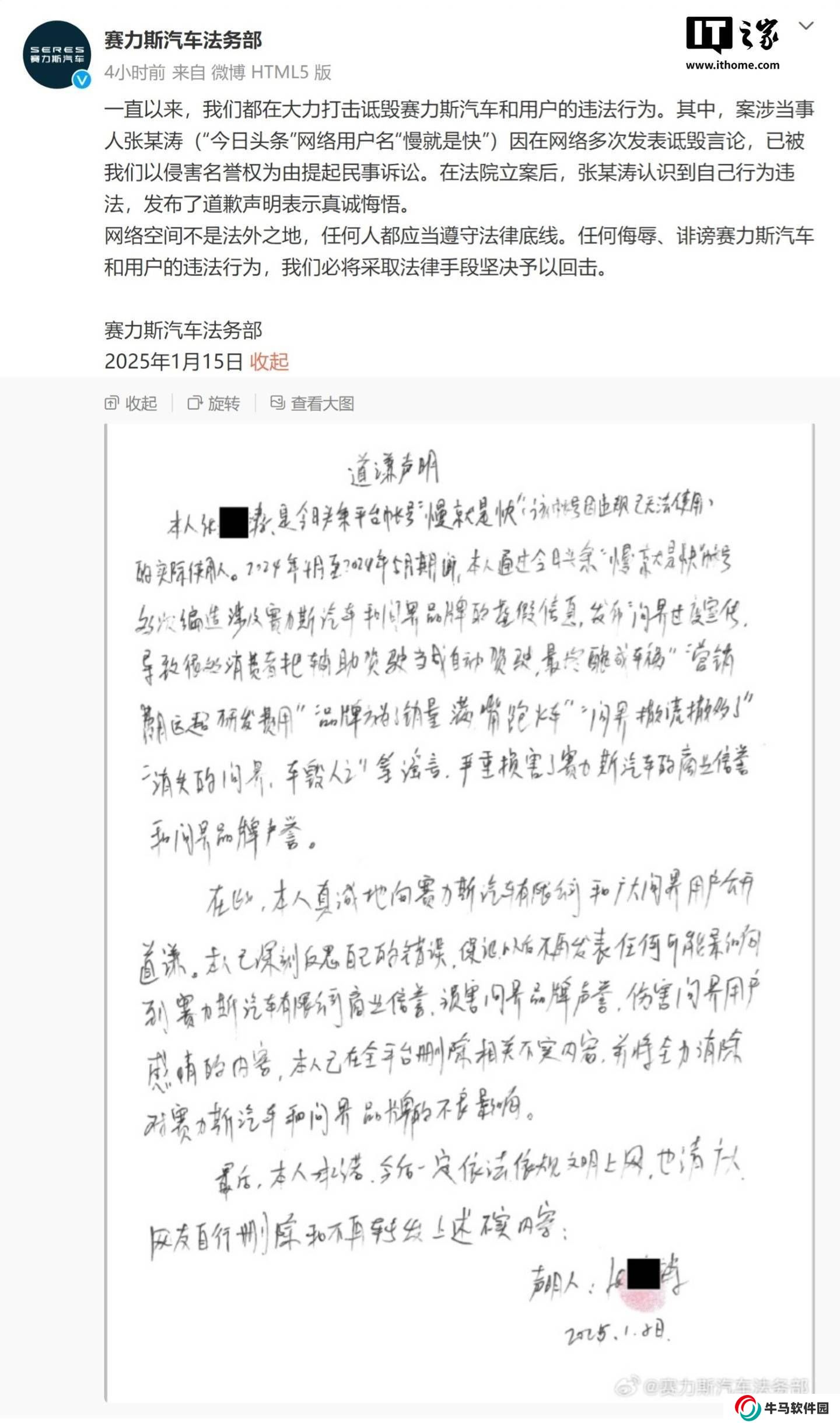 賽力斯汽車法務(wù)部嚴(yán)正聲明:網(wǎng)絡(luò)詆毀者張某濤已道歉,法律底線不容觸碰!