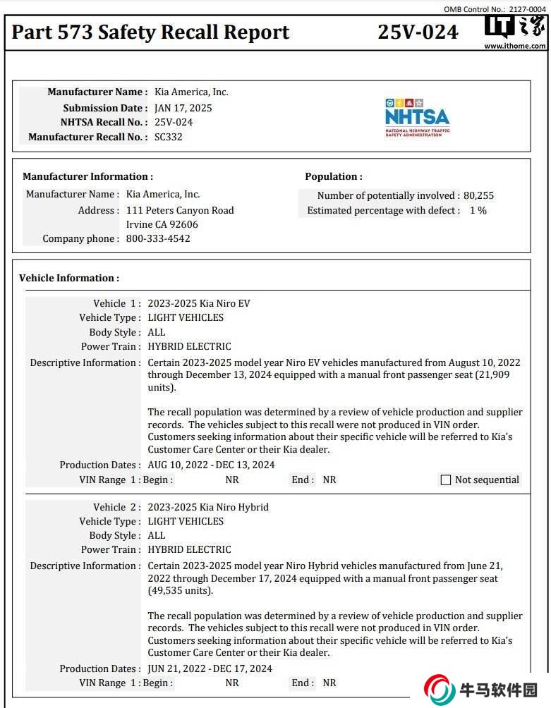 近日,美國國家公路交通安全管理局(NHTSA)發(fā)布了一項重要公告,指出起亞公司將主動召回在美國銷售的部分2023至2025年款Niro系列車型,涉及數(shù)量高達80,255輛。此次召回范圍覆蓋了Niro的