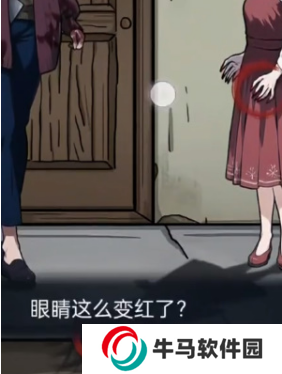 2、找出詭異地方后進入劇情來到屋外找出母女兩個人的不對勁地方。妹妹的影子和她詭異的笑容以及她那超長的指甲;母親紅色的眼睛,手上的血和腰間的菜刀。