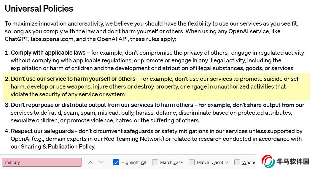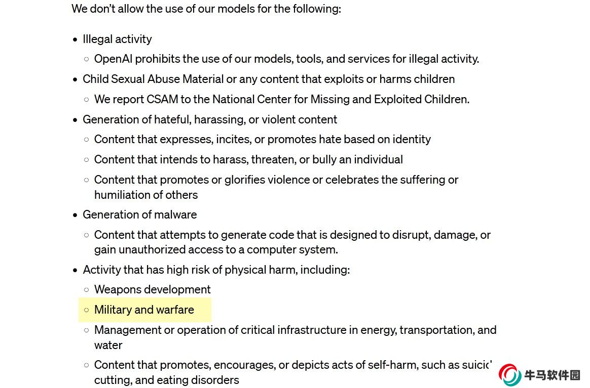 新政策保留了不得“使用其服務(wù)傷害自己或他人”的禁令,并以“開發(fā)或使用武器”為例,但“軍事和戰(zhàn)爭”這個更全面的禁令已經(jīng)不復(fù)存在。