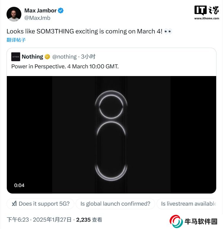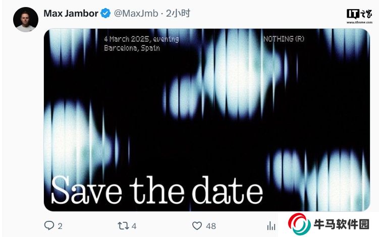 雖然 Nothing 沒(méi)有直接透露新設(shè)備的名稱(chēng),但爆料人士 Max Jambor 暗示,新品可能是 Nothing Phone 3。在另一條推文中,Jambor 還發(fā)布了一份看似官方的邀請(qǐng)函,提到 3 月 4 日在西班牙巴塞羅那舉行的活動(dòng)。這表明 Nothing 很可能會(huì)在巴塞羅那舉行的世界移動(dòng)通信大會(huì)(MWC)期間發(fā)布新手機(jī),該大會(huì)將于當(dāng)?shù)貢r(shí)間 3 月 3 日開(kāi)幕。