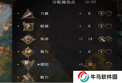 3.由于它的特殊戰(zhàn)斗方法我們的屬性加點(diǎn)絕大部分都加在感知敏捷和體質(zhì)上。
