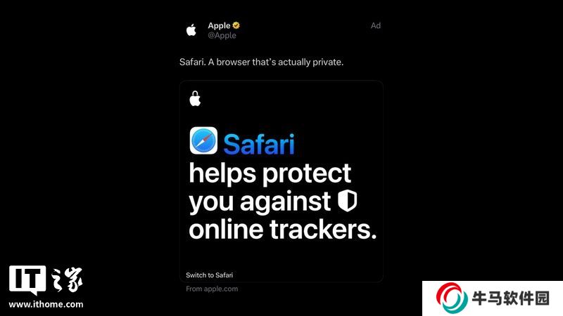 據(jù)觀察,蘋果的官方賬號 @Apple 目前投放了一則廣告,宣傳 Safari 瀏覽器的隱私功能。此外,蘋果的 @AppleTV 賬號也在為 Apple TV + 的劇集《Severance》投放廣告。