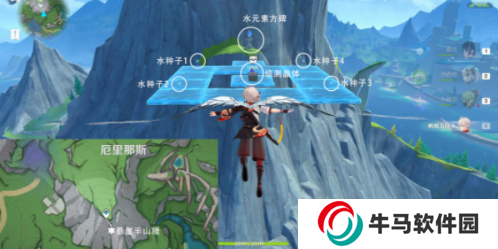 傳送厄里納斯南方向山頂錨點,往地圖的東南方向下飛,前往懸崖半山腰;激活圖中1個水元素方碑,拾取3個水種子,激活偵測晶體。