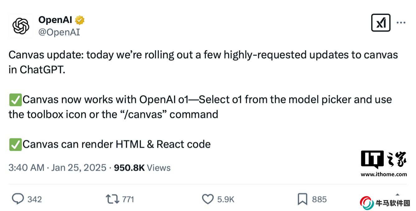本站 2 月 2 日消息,OpenAI 本周宣布對旗下ChatGPT Canvas 寫作工具進(jìn)行更新,主要上線 o1 模型、新增支持渲染 HTML 和 React 代碼,同時(shí) Canvas 功能也正式登陸 ChatGPT macOS應(yīng)用(此前只支持在網(wǎng)頁瀏覽器中使用)。