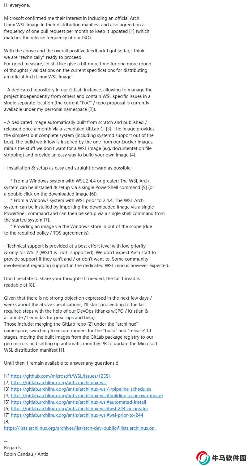 微軟向我確認了他們有興趣在其發(fā)行清單中加入一個官方的 Arch Linux WSL 鏡像,并同意每月拉取一次以保持更新(這正好符合我們的發(fā)布節(jié)奏)。有了以上這些以及到目前為止我收到的總體積極反饋,我認為我們在技術(shù)上已經(jīng)準備好繼續(xù)推進。為了穩(wěn)妥起見,我打算留出更多時間,就當(dāng)前分發(fā)官方 Arch Linux WSL 鏡像的規(guī)范再進行一輪思考 / 驗證。