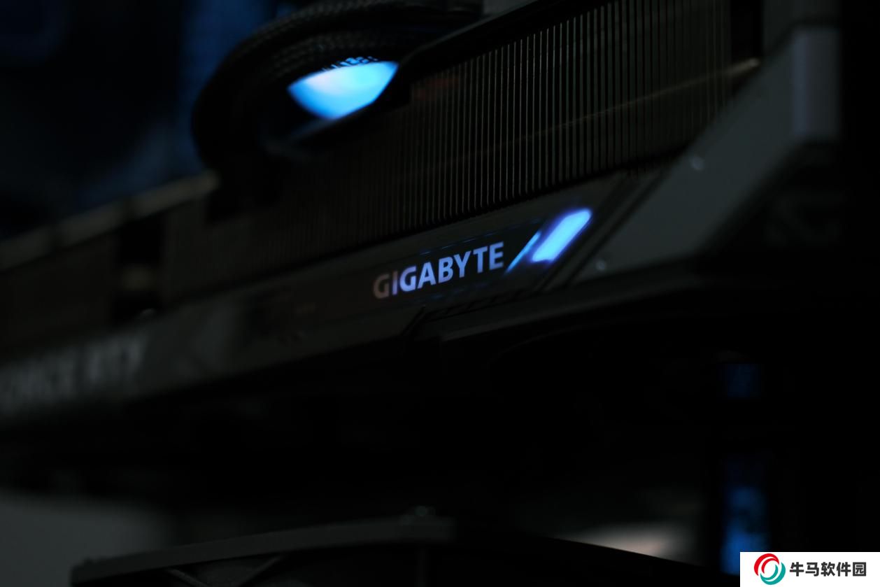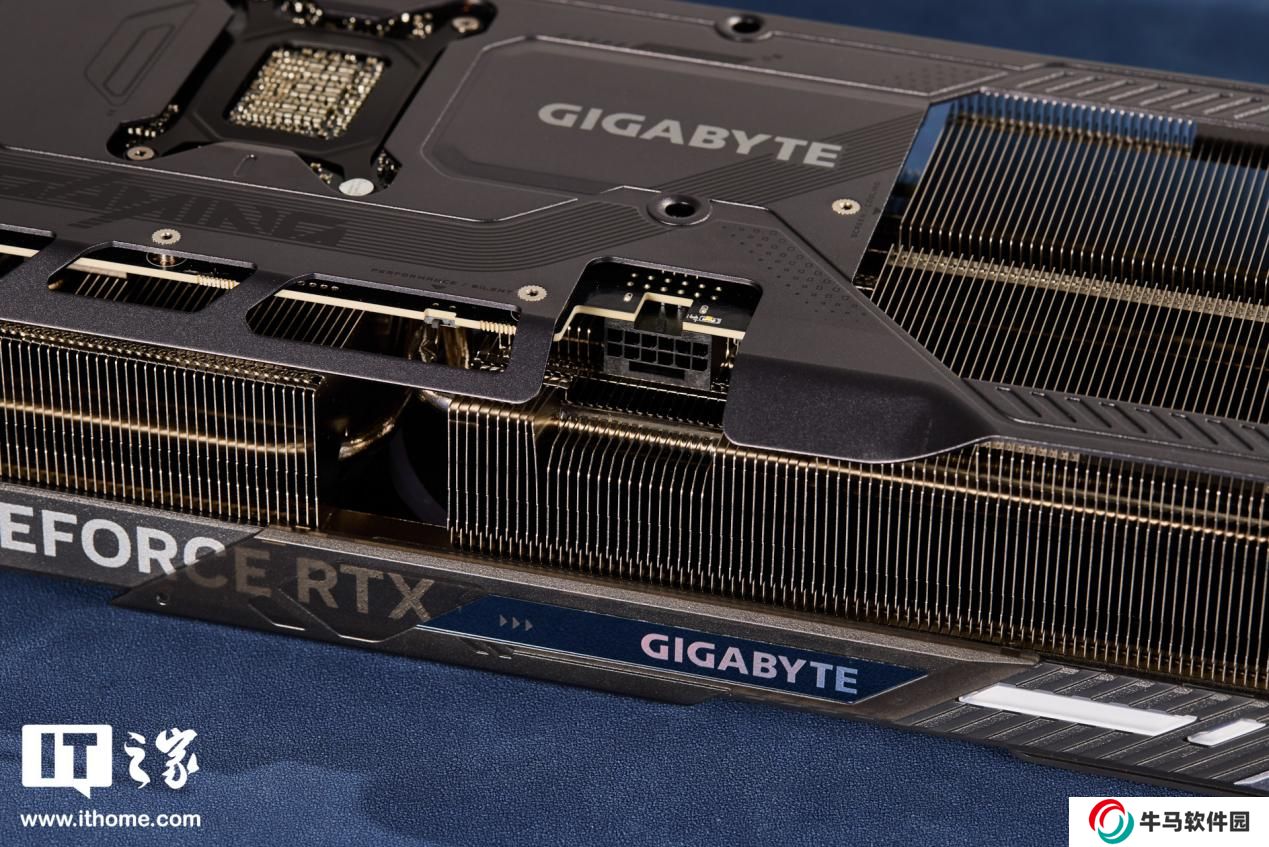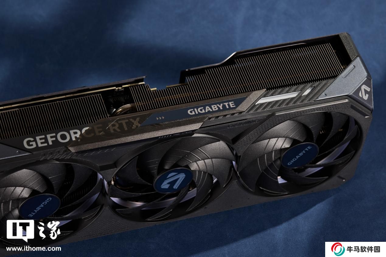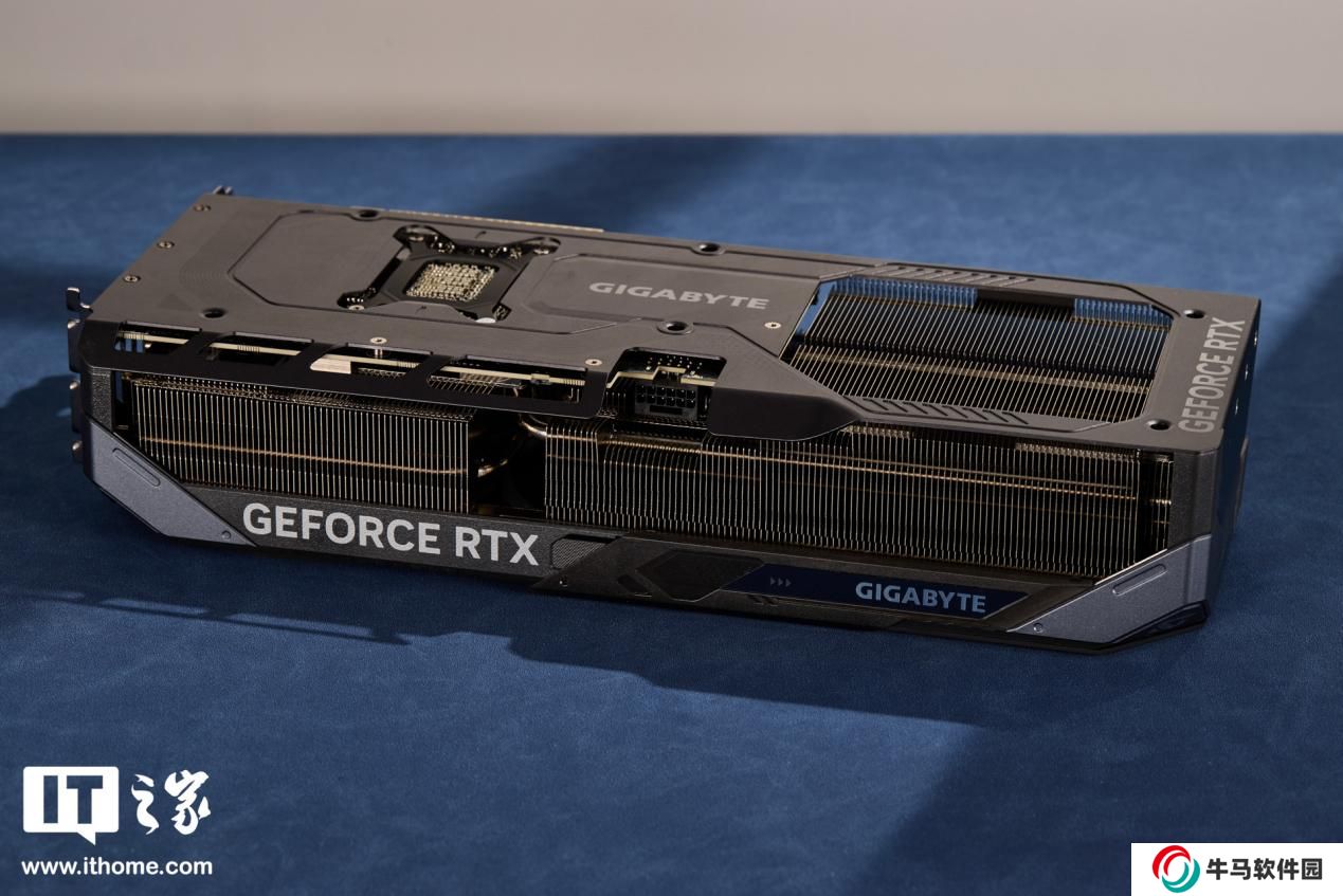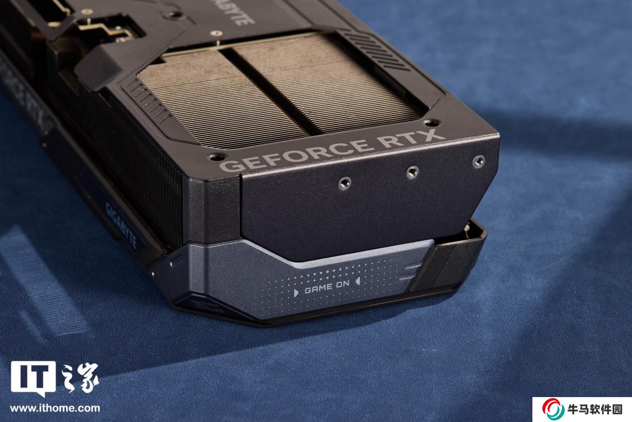 技嘉魔鷹 RTX 5080 的頂部為大面積散熱鰭片,左側印有 GEFORCE RTX LOGO 右側則是支持滑動的 GIGABYTE 的 LOGO,可透過 RGB 燈條發(fā)光。