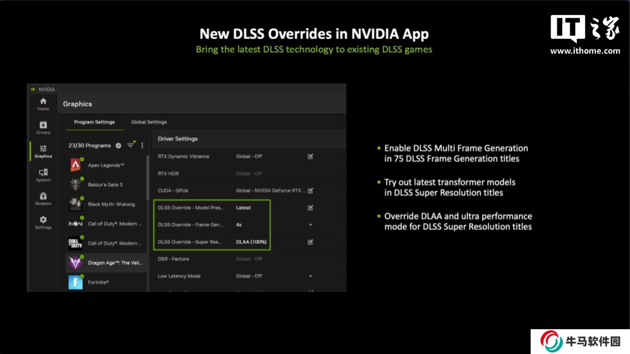 針對目前 DLSS 4 適配游戲較少的問題,英偉達推出了 DLSS Override 功能進行緩解,這個功能能讓支持 DLSS 且還沒有適配 DLSS 4 的游戲獲得 DLSS 4 的幀生成和超分體驗。