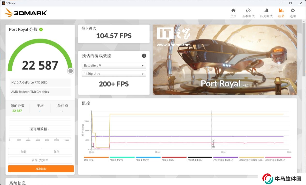 在 3DMark Portal Royal 實時光追測試中,技嘉 GeForce RTX 5080 GAMING OC 16G 的綜合分為 22587 分,作為對比 RTX 5080 公版為 22060 分,RTX 4080s 公版的分數(shù)為 18439 分,提升幅度達到了 22%。
