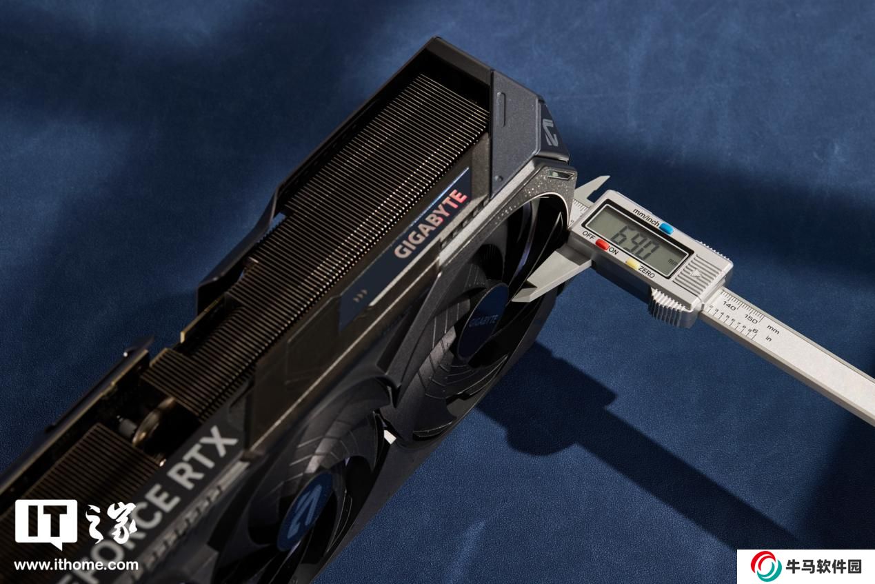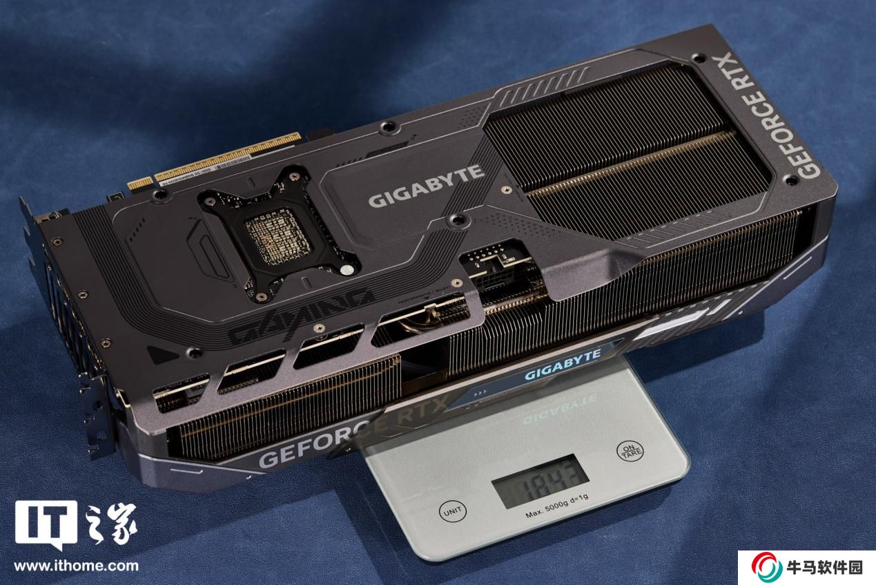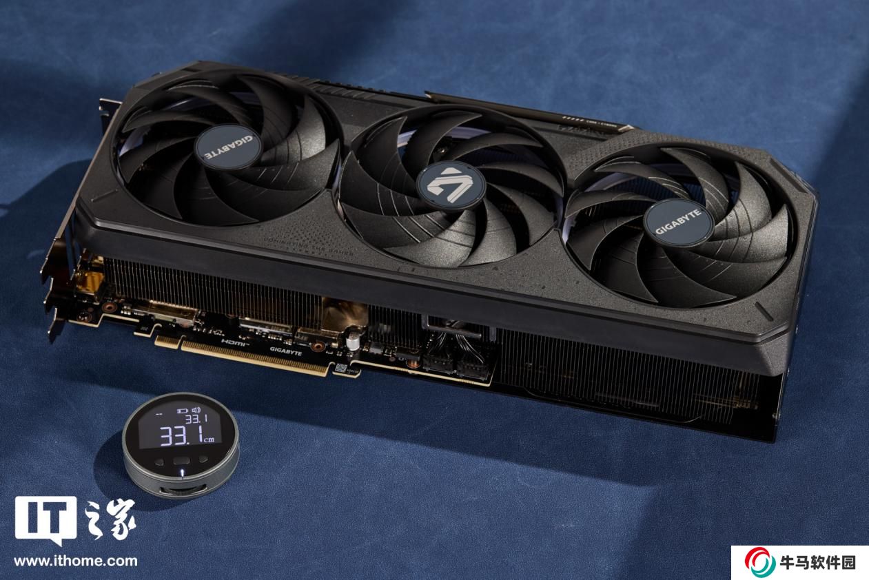 體積方面經(jīng)過本站實測,技嘉魔鷹 RTX 5080 顯卡的三圍分別是 330*128*69mm(不含金手指與擋片),裸卡重量約 1.84kg。