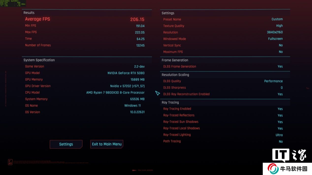 在 2K 分辨率 + 極高畫質 + 開啟光追 + DLSS 質量下,游戲平均幀數(shù)為 181 幀,1% Low 幀 164 幀;