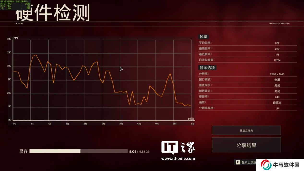 在 2K 分辨率 + 極高畫質下,游戲平均幀數(shù)為 209 幀,1% Low 幀 191 幀;