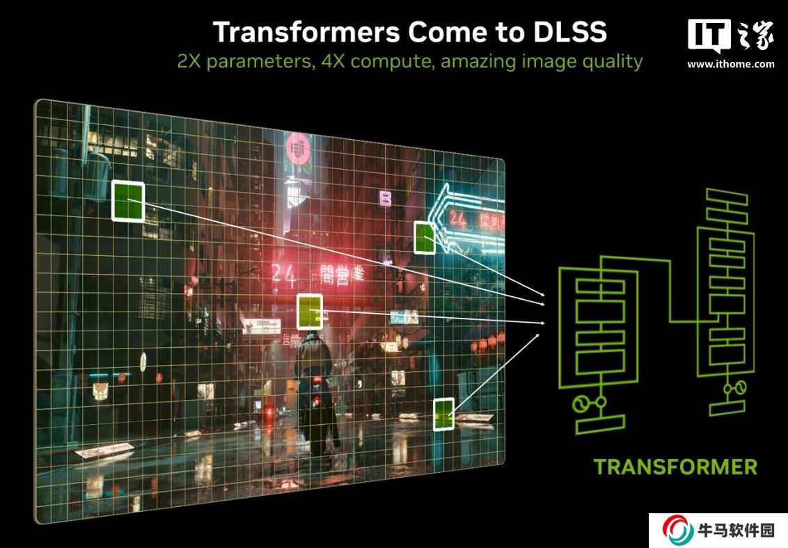 DLSS 4 技術實現(xiàn)了模型架構的重大革新。DLSS 光線重建、DLSS 超分辨率以及 DLAA 這些特性,均由首個實時 Transformer 模型驅動,該模型旨在提升生成像素的質量。它能夠借助自注意力操作,對一幀或多幀畫面中的每個像素的重要程度進行評估,從而更好地理解場景中的各種關系。通過這種方式,生成的像素穩(wěn)定性更佳,偽影更少,同時在運動細節(jié)的呈現(xiàn)上更為豐富,邊緣也更加平滑。