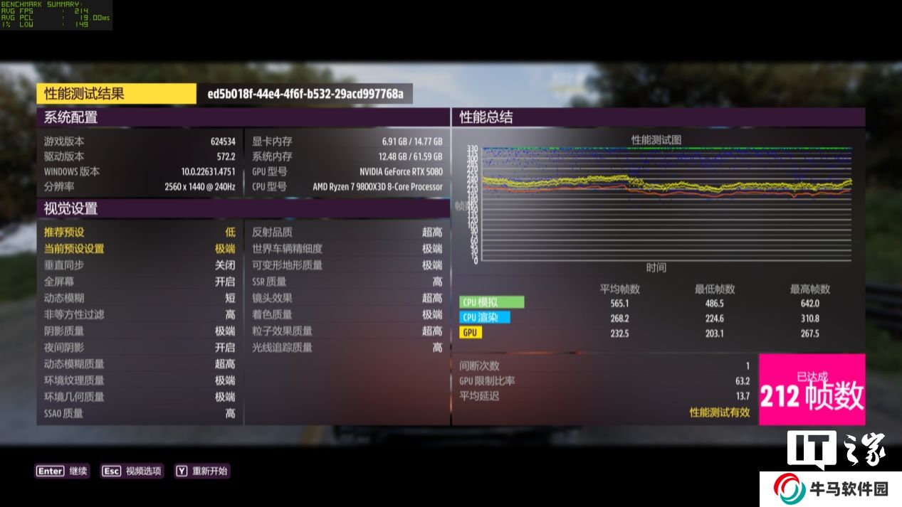 在 2K 分辨率 + 極端畫質下,游戲平均幀數(shù)為 212 幀,1% Low 幀 149 幀;